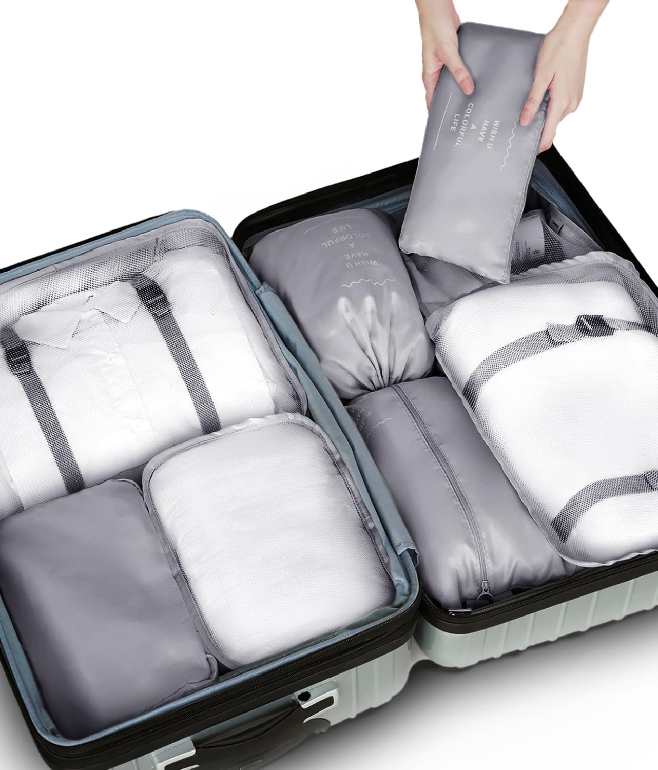 مع منظم الحقائب من 8 قطع تمكنك من وضع كل ملابسك وأغراضك في الحقيبة مع تنظيمها وحميتها، إضافة إلى توفير المساحة بكل سهولة.